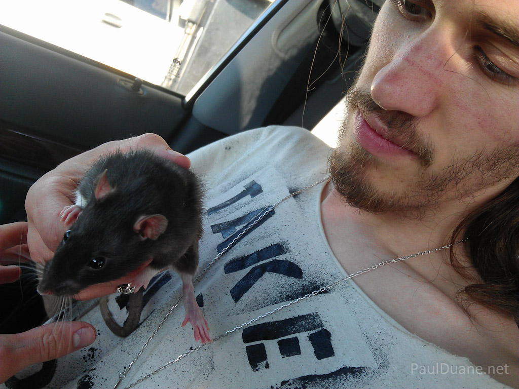 Lucky for him, I spent lots of time working with rats in the behavior lab at Utah State University in my college days. Lucky for him, I think rats are pretty cool. Actually, that’s really just lucky for me, because let’s say I didn’t like rats. What would I have done? Would I have freaked out and told him to get the rat out of my car? That could have been weird. At any rate, I was totally cool with it. He kept the rat in a little box in his backpack 95% of the time, anyway, only bringing him out occasionally to feed / water it.