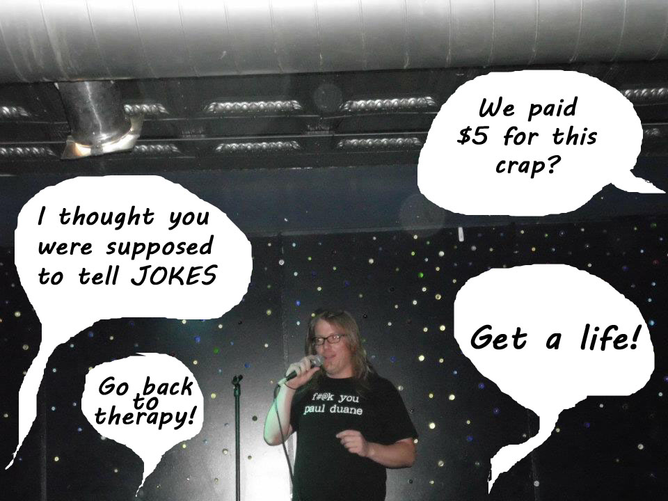 This whole exchange really only lasted about 3 seconds, but in that moment, time slowed and it was a lengthy, drawn out public humiliation that went on for hours. It wasn’t enough for him to just get on with bringing up the next comic, he had to do and say everything possible to make me look stupid. He does this every week. He tends to compliment some comics after their set, but he always berates me as I leave the stage. Every. Single. Week. This is obviously part of his whole alpha-male schtick. He’s one of these guys that probably got laughs in high school by being a bully, and mistook that for having a sense of humor. I’ve seen his stand up. He’s not funny. But, he is efficient at keeping the show moving, I’ll give him that. Anyway, on with my tale of suffering: