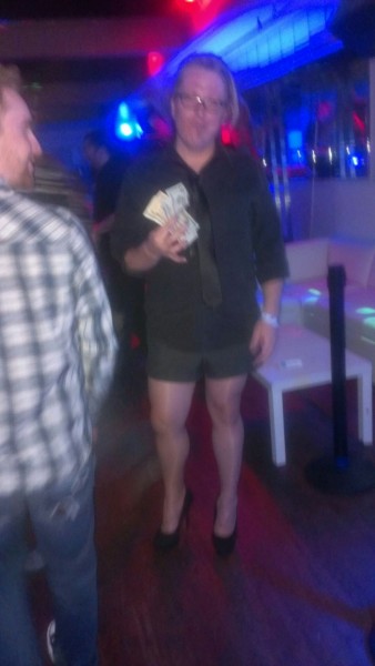 It came time for me to stand up on the stage and strut my stuff. I jumped up there, put my stiletto clad foot on a piece of white leather furniture, and ran my finger from my ankle all the way up my leg to my upper thigh, and then turned to the audience and beckoned their applause. I’m not trying to brag, but… they pretty much loved me. The audience made my victory clear. I walked way with $250 cash. 🙂
