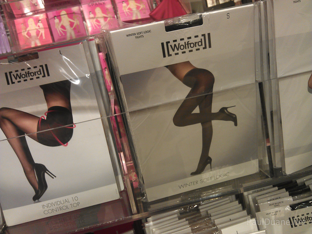 The Portland Nordstrom carries Wolford hosiery. Yet another great thing about this city. For those of you who don’t know, these are the top brand in the world. Wolford is made in Austria, and is the top choice in almost all fashion shoots where wardrobe includes hosiery. They have the best fit, they look amazing, they feel luxurious on your skin, and they last longer than any other brand. Most sell for about $50 / pair. Ladies, if you are of the idea that pantyhose / tights are uncomfortable, you owe it to yourself to try Wolford’s products. Hell, even if you are of the persuasion that you enjoy hosiery – maybe even more so, you deserve to try Wolford.