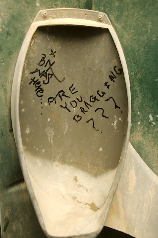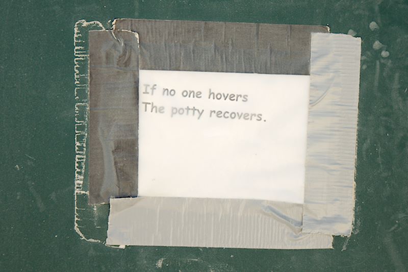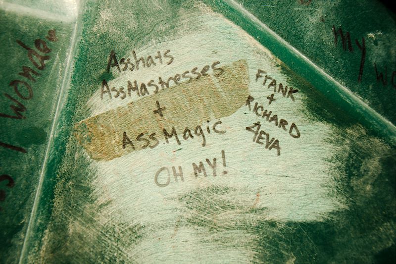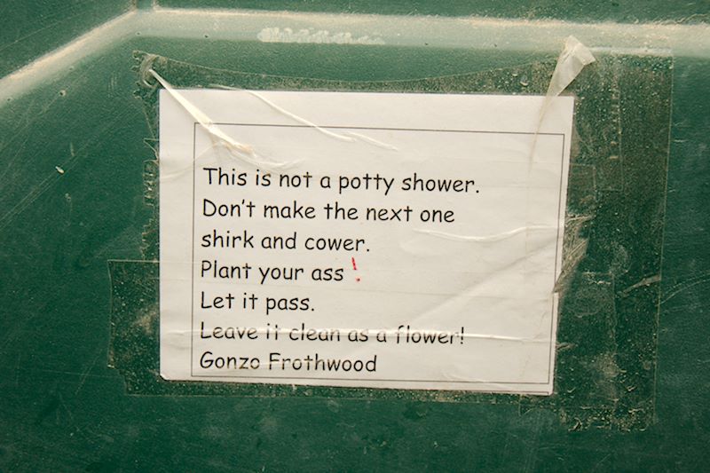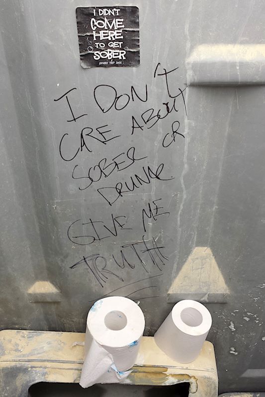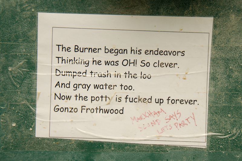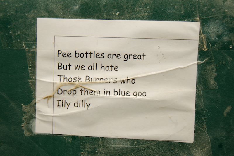 One must also leave no trace on the desert floor… that’s one of the 10 Principles of Burning Man. Hence, porta potties. One of the things I adore about Burner culture is the way it embraces both the profane and the profound and lets them co-exist, simultaneously. I thought the porta potties were a poetic, if not stinky, example of this ethos. Nearly every porta potty interior is adorned with some kind of graffiti. Here are some of my favorite moments from inner walls of the 2015 Porta Potties: