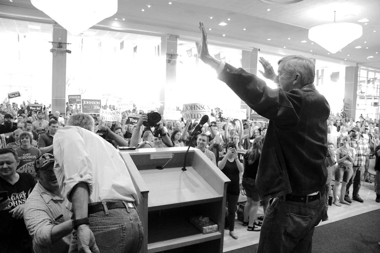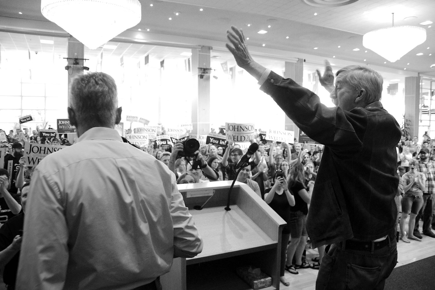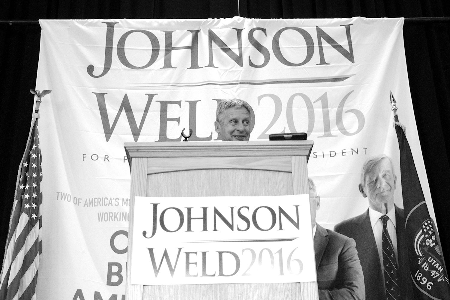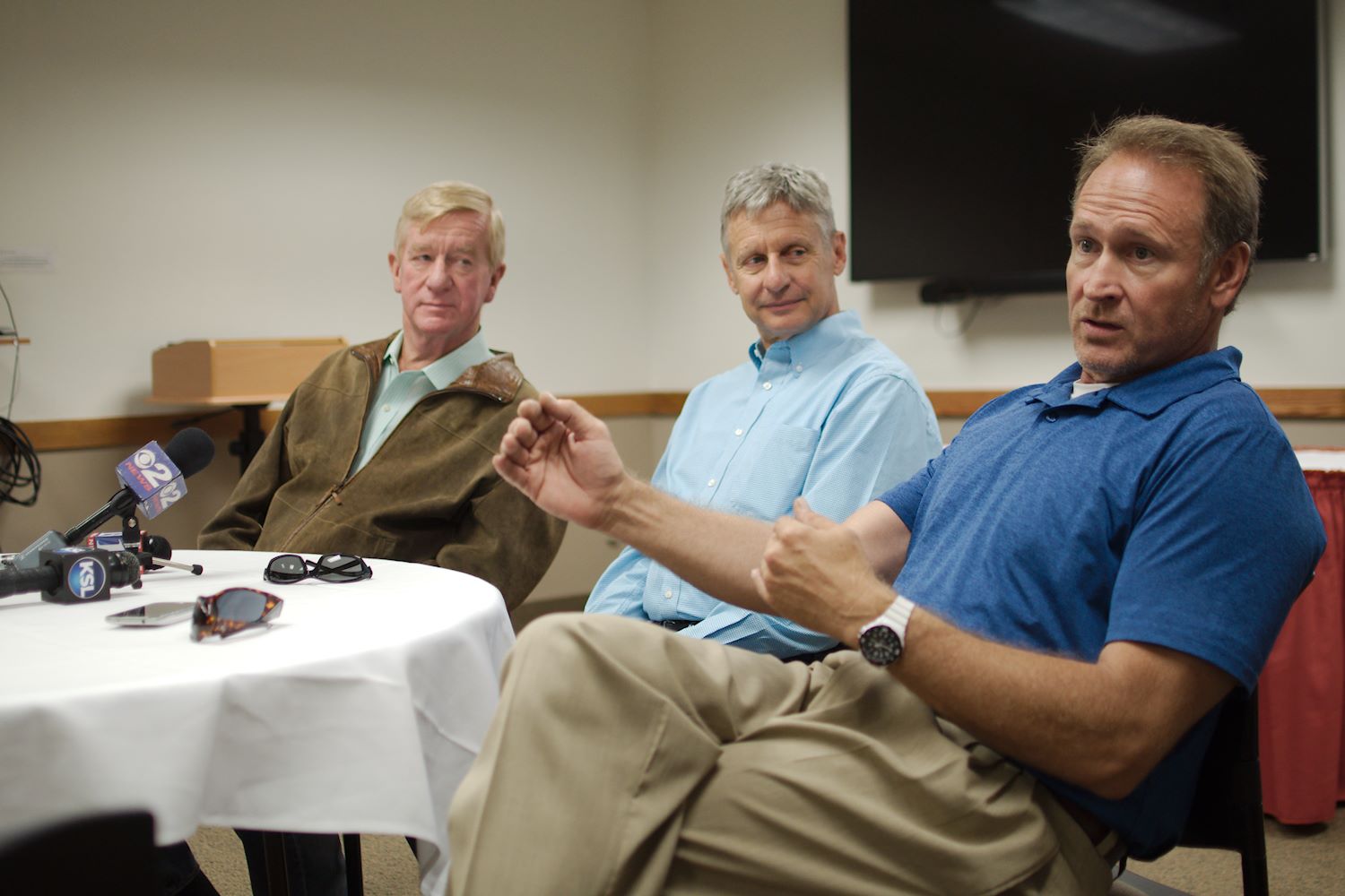 Governors Johnson and Weld came to Salt Lake City on 6 Aug for a rally at the University of Utah. We had an awesome turnout, a roaring crowd of 1500 people along with coverage from every news outlet in town. I had the privilege of photographing the event and participating in the press conference beforehand. The podcast episode attached to this post contains the audio from the press conference. Senator Mark Madsen (newly minted Libertarian, having recently left the Republican Party), joined Johnson & Weld for the media Q&A.